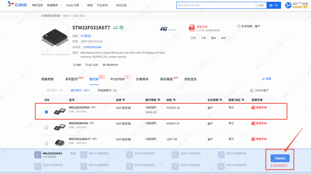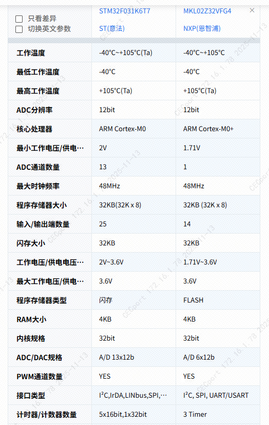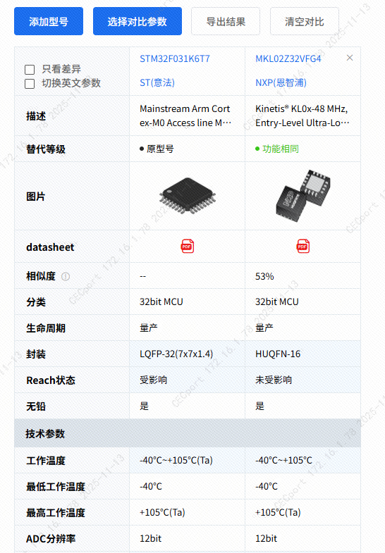 输入“STM32F031K6T7“,系统快速匹配“MKL02Z32VFG4”。一颗应用定位相似的竞争对手(二者均属Cortex-M0家族,主频与存储相近,M0+能效更优)。美中不足是系统提示相似度53%,两者封装与软件生态不同(如图-使用替代参数对比),建议作为初期备选,结合实际需求评估。