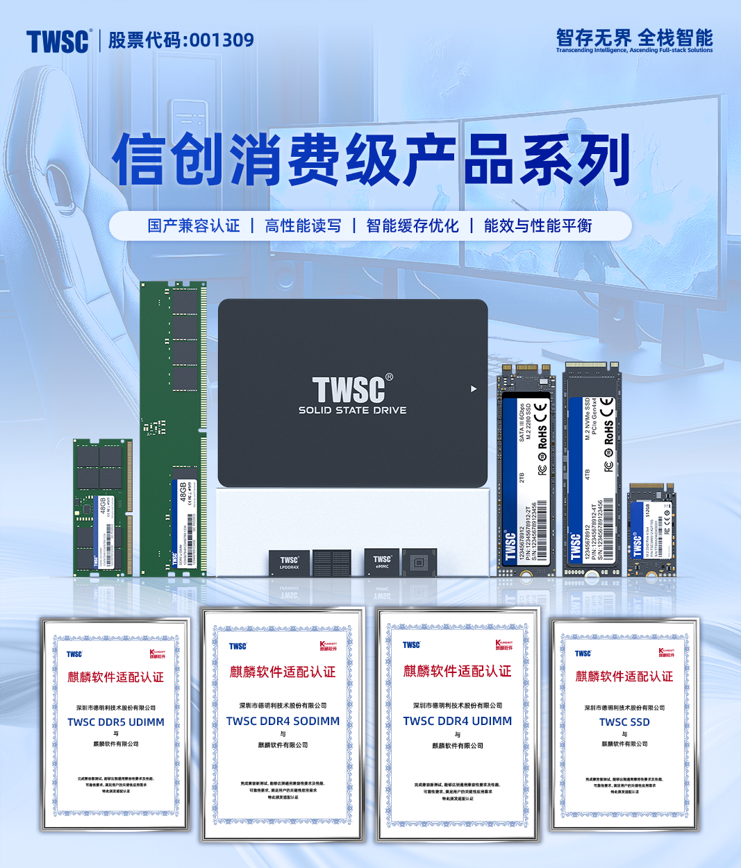 面向桌面办公、终端整机、教育信息化等消费级场景,德明利推出SATA与PCIe系列固态硬盘以及DDR4/DDR5内存条信创产品,具备高速传输、低延迟与稳定耐久等特性,产品已完成银河麒麟桌面操作系统等主流国产平台的兼容性测试,能够满足行业关键应用需求。