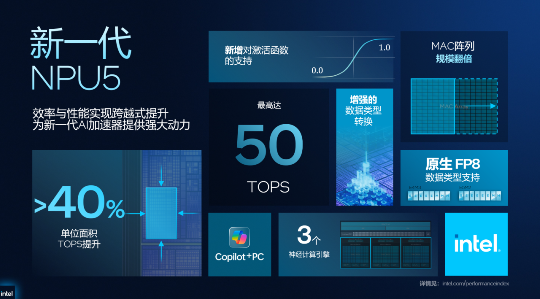 这一代酷睿Ultra搭载的NPU5专门为AI任务优化,单位面积算力(TOPS/mm²)提升超过40%2。它的能效比更高,处理AI又快又省电。不仅如此,这一代NPU专为生成式AI量身打造,支持原生FP8数据类型,进一步提升了NPU算力。