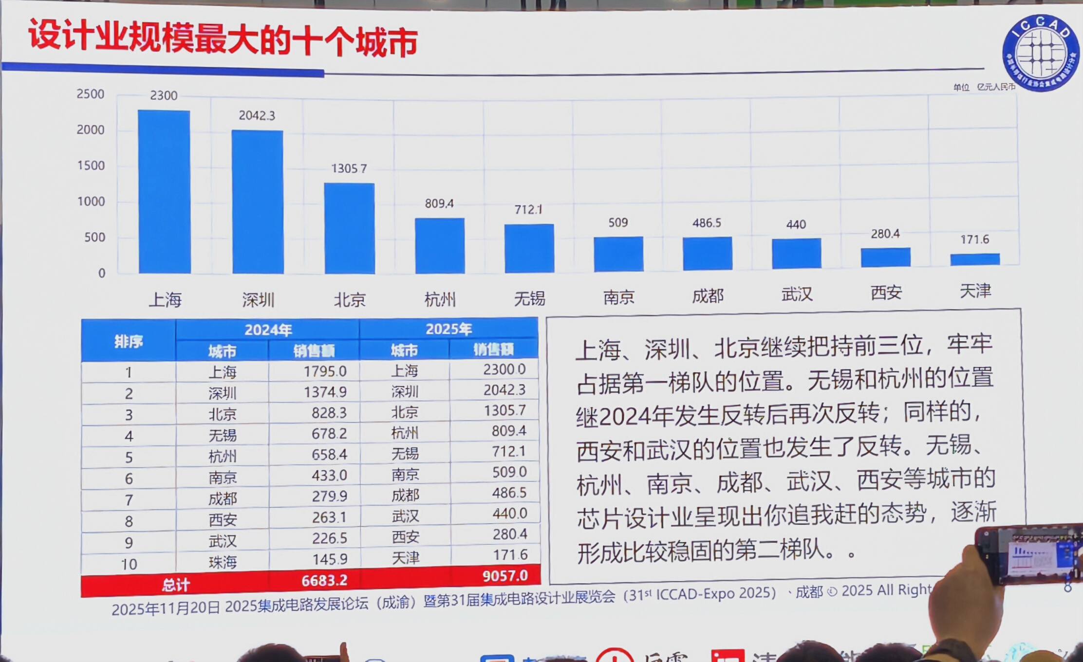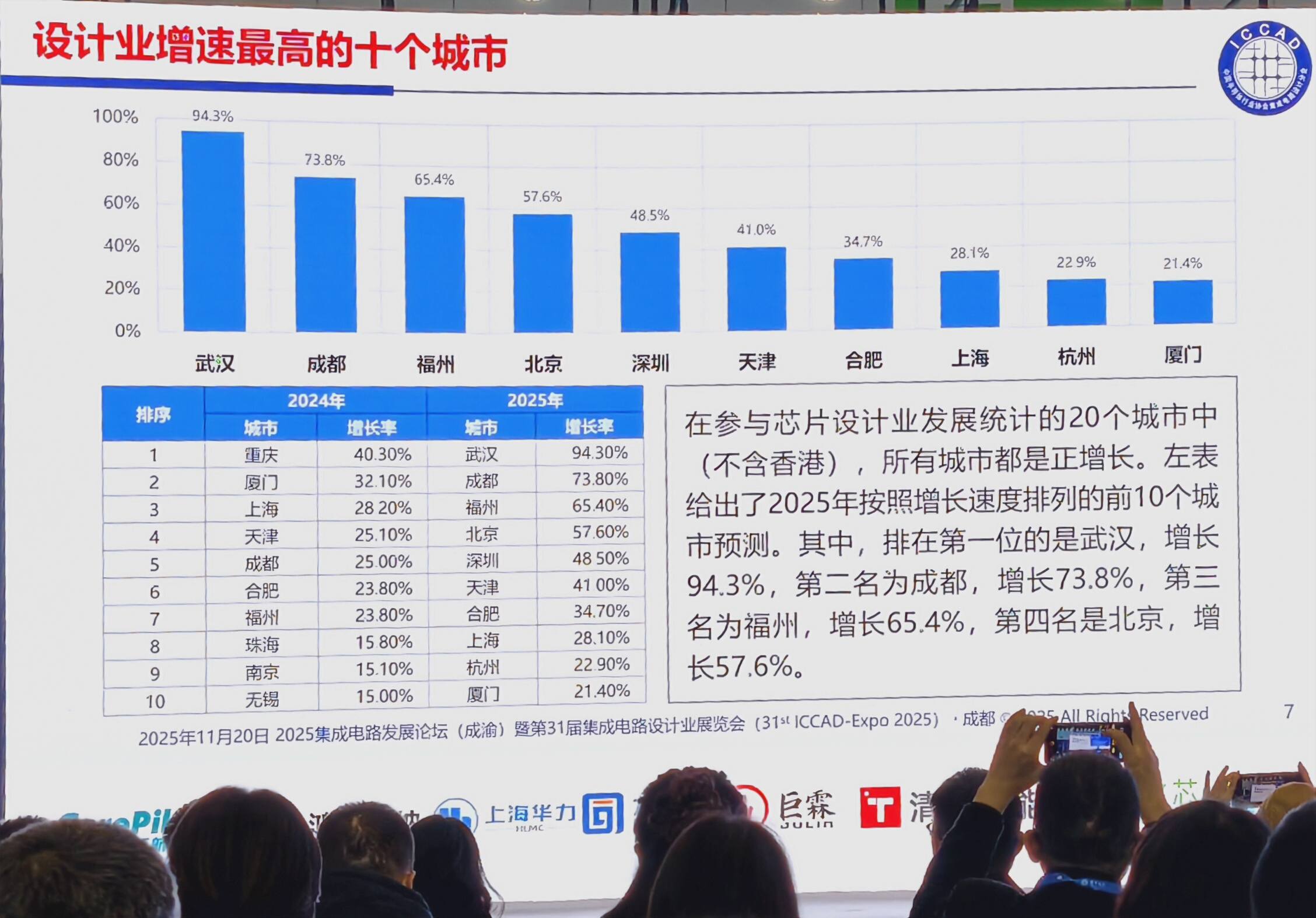从区域分布来看,参与芯片设计业发展统计的20个城市中(不包含香港),所有城市都是正增长的。其中增长速度最快的是武汉,增长了94.3%;其次是成都,增长了73.8%;第三是福州,增长了64.4%;随后是北京、深圳、天津、合肥、上海、杭州和厦门。