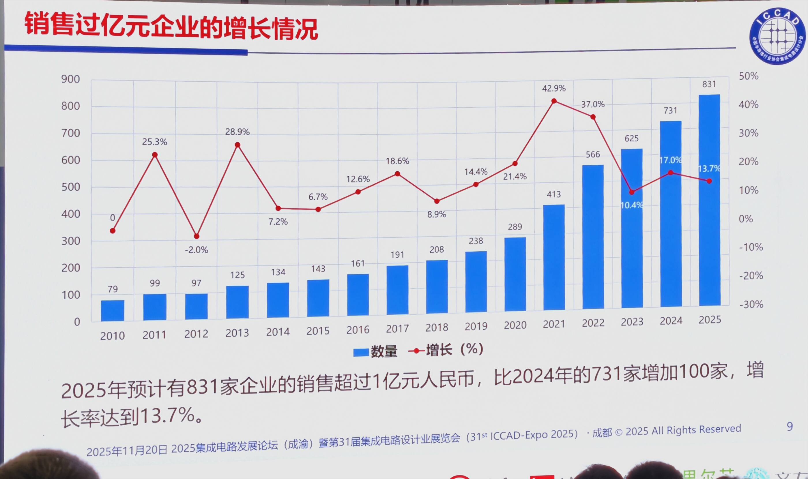 从企业方面来看,2025年预计有831家芯片设计企业的销售额超过了1亿元,与2024年的731家相比,增加了100家,增长率达到了13.7%。