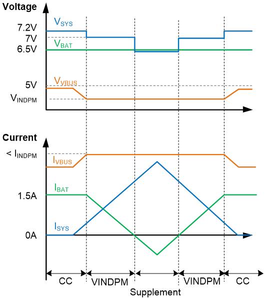 图 7 VINDPM(输入电压动态功率管理)策略下系统电压、电池电压和电流的变化曲线