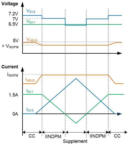 SGM41574/5 支持输入动态功率管理(DPM)功能,可实时监测并限制输入电压和输入电流,避免输入适配器过载或超出最大电流限制。在 DPM 模式下,芯片会通过动态调整充电电流优先保证系统供电需求,在系统功率较大的时候,支持电池与适配器一起为系统供电。SGM41574/5 还集成一种输入电流优化能力(ICO),可以监测调节最大输入电流限制,避免输入适配器工作在 VINDPM 过载状态。