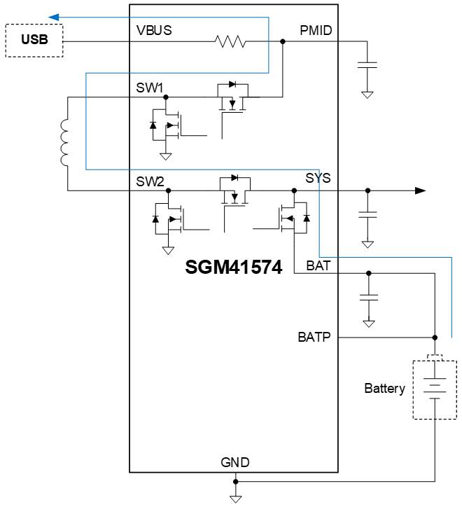SGM41574/5 采用 NVDC 充放电路径管理架构,内置 BATFET 连接电池与系统,支持动态电源路径管理,可在适配器供电、电池补电及混合模式间智能切换。即便在没有电池或电池电量完全耗尽的情况下,系统电压仍可稳定维持在预设最低电压以上。当输入端适配器功率足够大,芯片可同时为系统供电和电池充电;当系统功率需求突增而适配器输入功率不足时,芯片会自动切换至补电模式,由电池和适配器一起为系统供电,确保设备正常运行。其正向功率传输路径如图 6 所示。