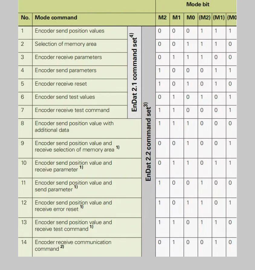 用于收发串行编码器协议中的命令数据。例如ENDAT协议中Mode Command字段为命令,其含义如下图: