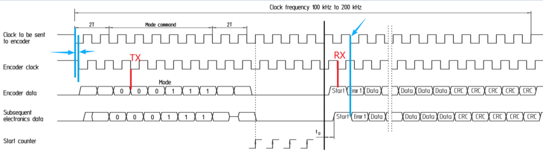 如下图ENDAT协议中所示,主机发出的clock在信号线上传输到达编码器,编码器根据clock信号发送位置数据,位置数据传输到主机时,如果主机仍然在下降沿采样,那么就会发生错误。