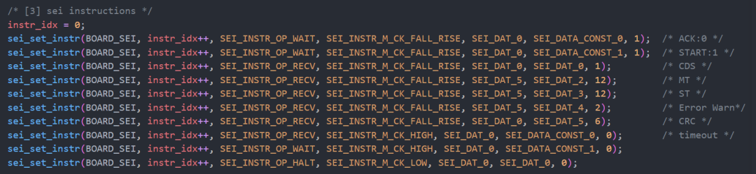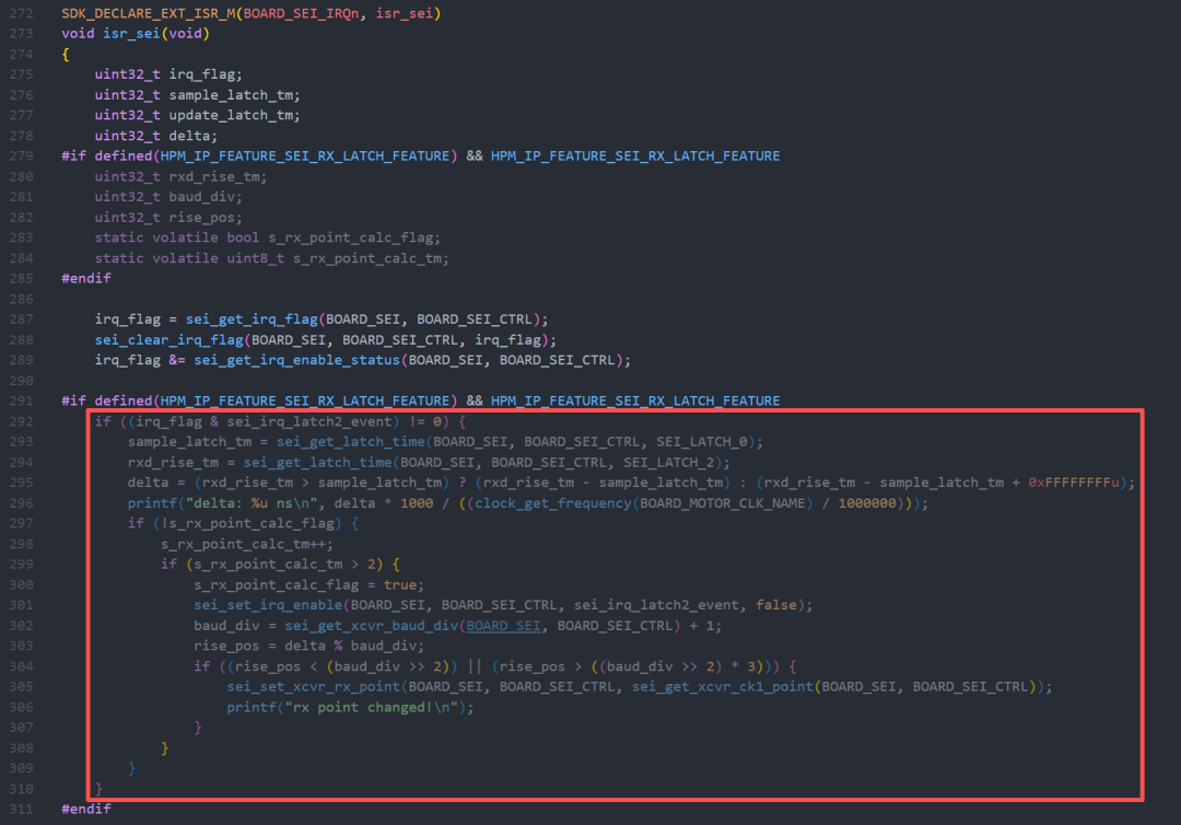 先楫SDK例程开发时充分考虑以上情况的发生,在SEI最初的通信过程中,会测量主机主动发出的clock信号下降沿与从机回复信号的start上升沿之间的时间差,来判断电信号在线缆中传输造成的相位偏移影响,对采样点进行调整,如下图代码: