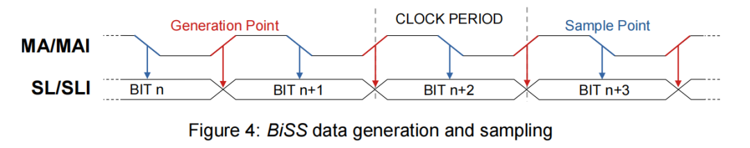 即意味着,SEI引擎会在下降沿采样接收信号线上的数据,在上升沿发送要发出的数据。BISSC协议主机不发送数据,只关注接收即可。