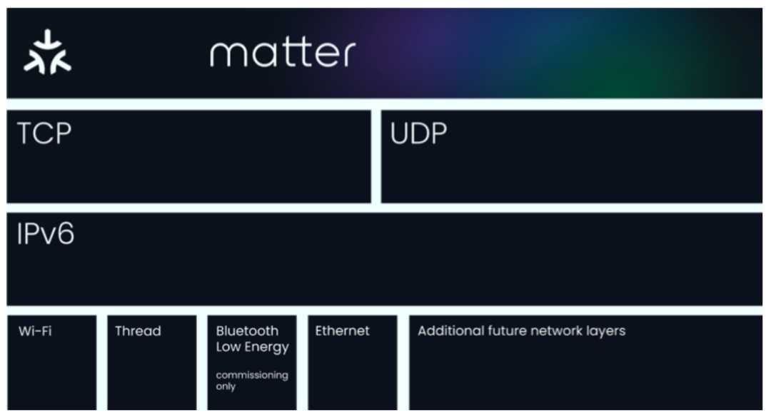 Matter设备将工作在统一的应用层中,且仅仅依赖传输层中的 IPv6 标准所构成的TCP/IP和UDP协议,从而兼容不同的物理介质和数据链路标准。因为IP网络是一个Mesh结构,所以Matter也将呈现为Mesh拓扑结构(由不同通信技术的子网络组成)。