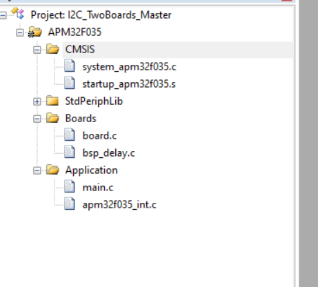 根据SDK文件中的示例,我打开了位于apm_sdk\Examples\I2C\I2C_TwoBoards\I2C_TwoBoards_Master\Project\MDK的工程。官方的文件结构非常清晰,CMSIS文件夹应该包含了M0+内核的文件和启动文件,StdPeriphLib则是存放官方外设库的地方。application文件夹中存放了main.c,而boards文件夹则应该用来存放板子上的外设,比如LED、按钮等。