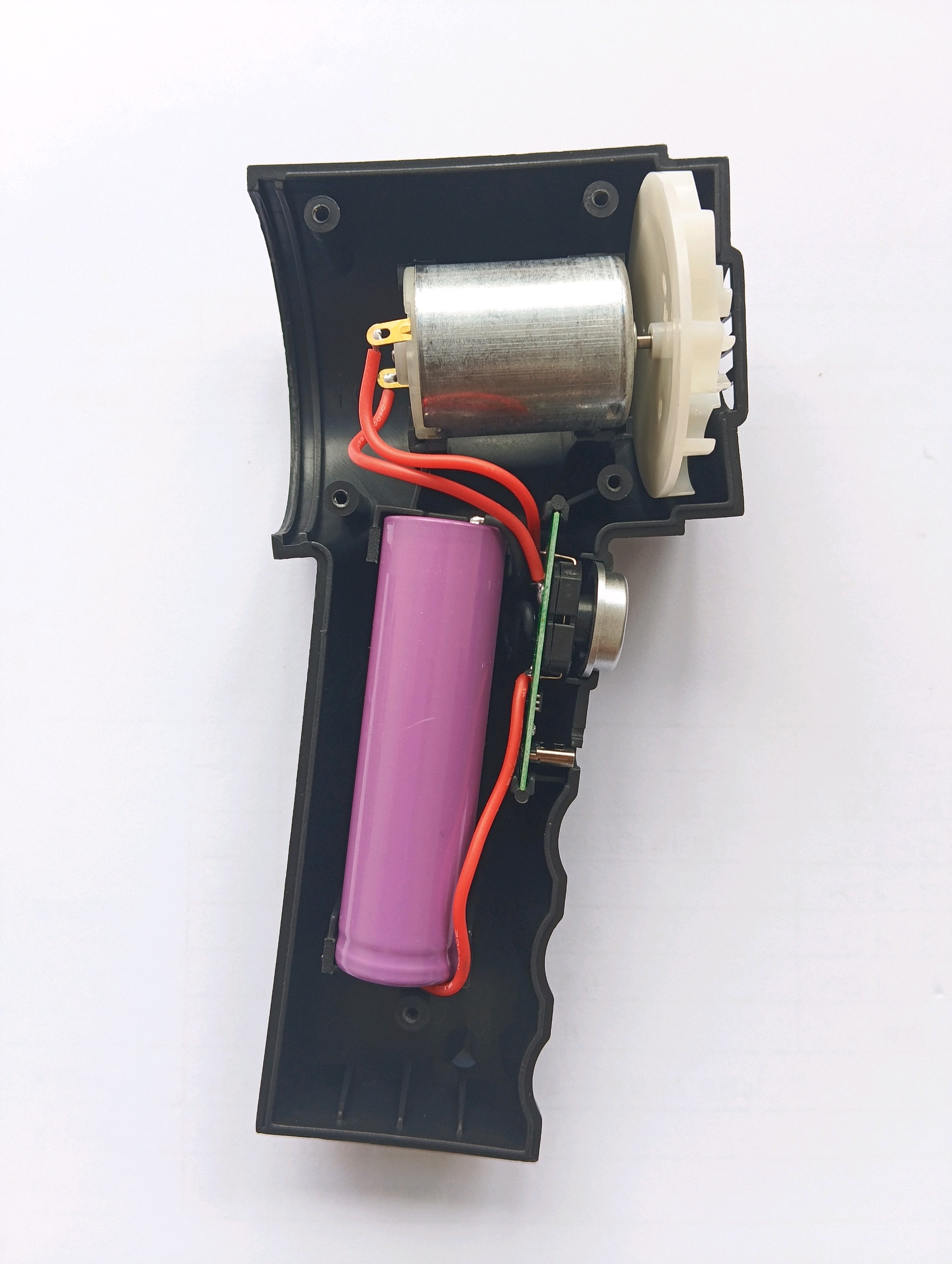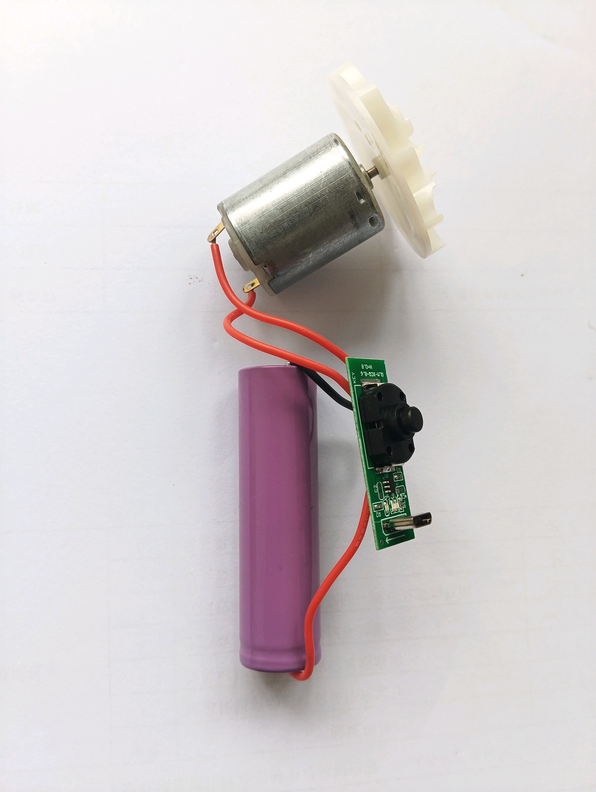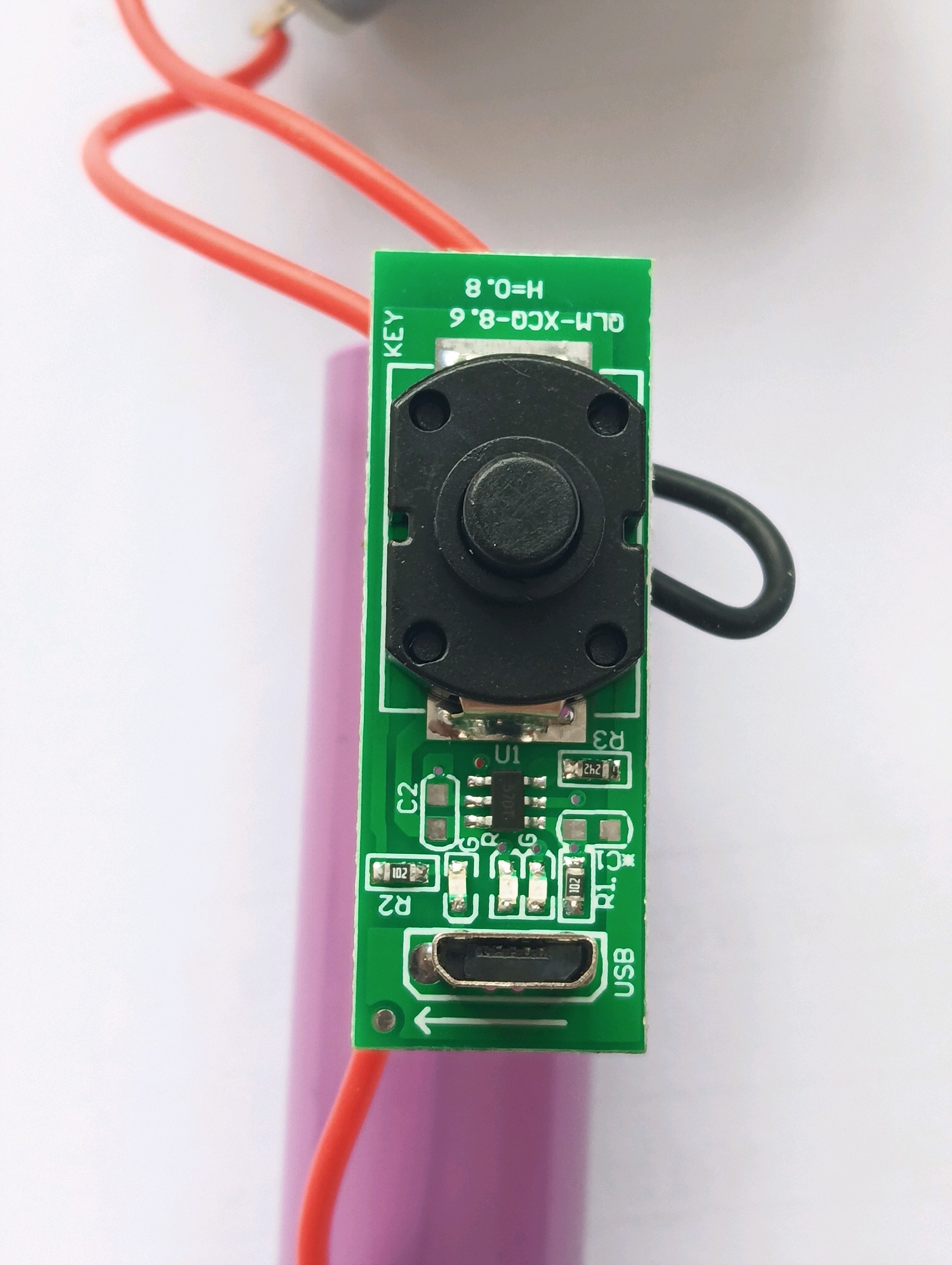 一节光杆18650电池,一个充放电控制板,一个有刷电机