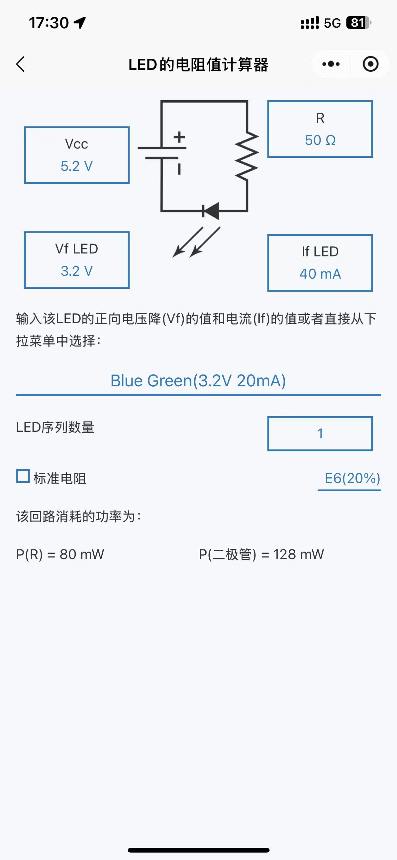这里取USB的最大电压5.2伏,计算出的限流电阻约为50欧,当然比这个稍微大一点也无所谓,小了的话就容易烧毁LED。