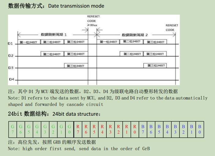 b:低电平复位时间最小为100us,为了留有余度,一帧数据传输过程中(包括 24bit 和 24bit 之间、bit和 bit 之间)不要中断超过 35us,否则可能会被 IC 认为是RESET。中断时间在 35us之内,控制器可以进行正常数据传输等其他操作。