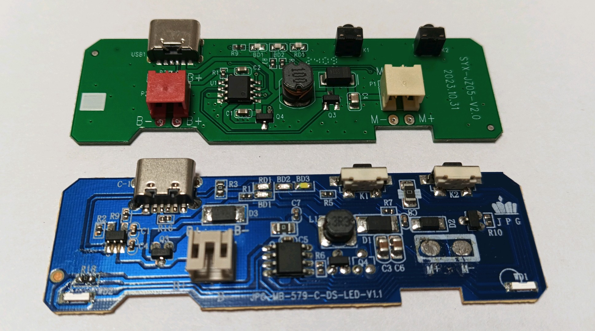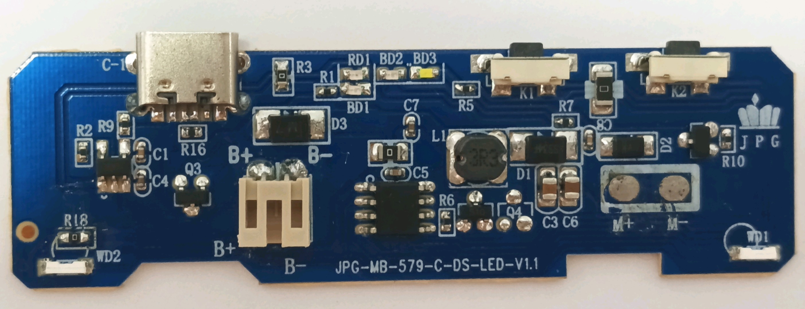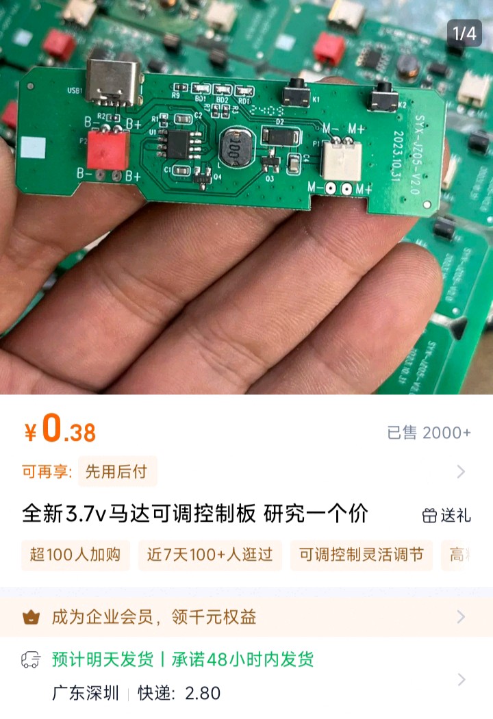 经过实测,控制板按钮可以切换4个档位,最低档电压和电池电压差不多,其他档位电压升高,这个控制板应该是一个boost升压电路。