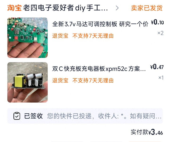 邮费2.8元,为了减少邮费的占比,买了两个板子,顺便买了一个快充充电器内芯。