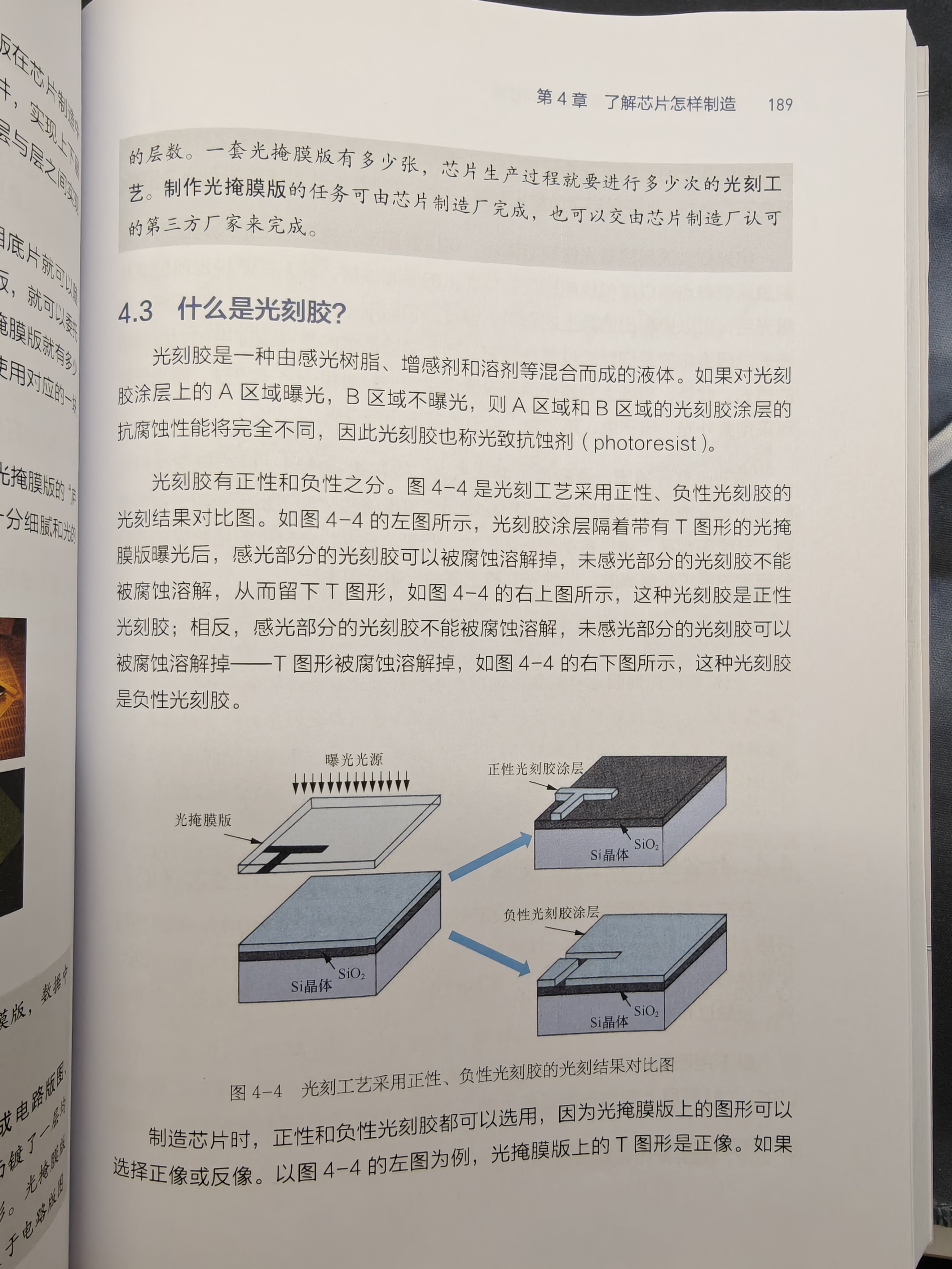 这张图片是彩色的,可以看到车间里是黄色的灯光,并不是为了营造氛围,而是出于一个至关重要的科学原因:为了保护一种对紫外线敏感的关键材料——光刻胶。什么是光刻胶,书中也有详细的介绍,可见光光谱中,紫外线的波长较短(约100nm - 400nm),能量很高,足以引发光刻胶的化学反应。而黄光的波长较长(约570nm - 590nm),能量较低,处于光刻胶敏感的波长范围之外。如果是传统的黑白色的书是表现不出这种效果的。