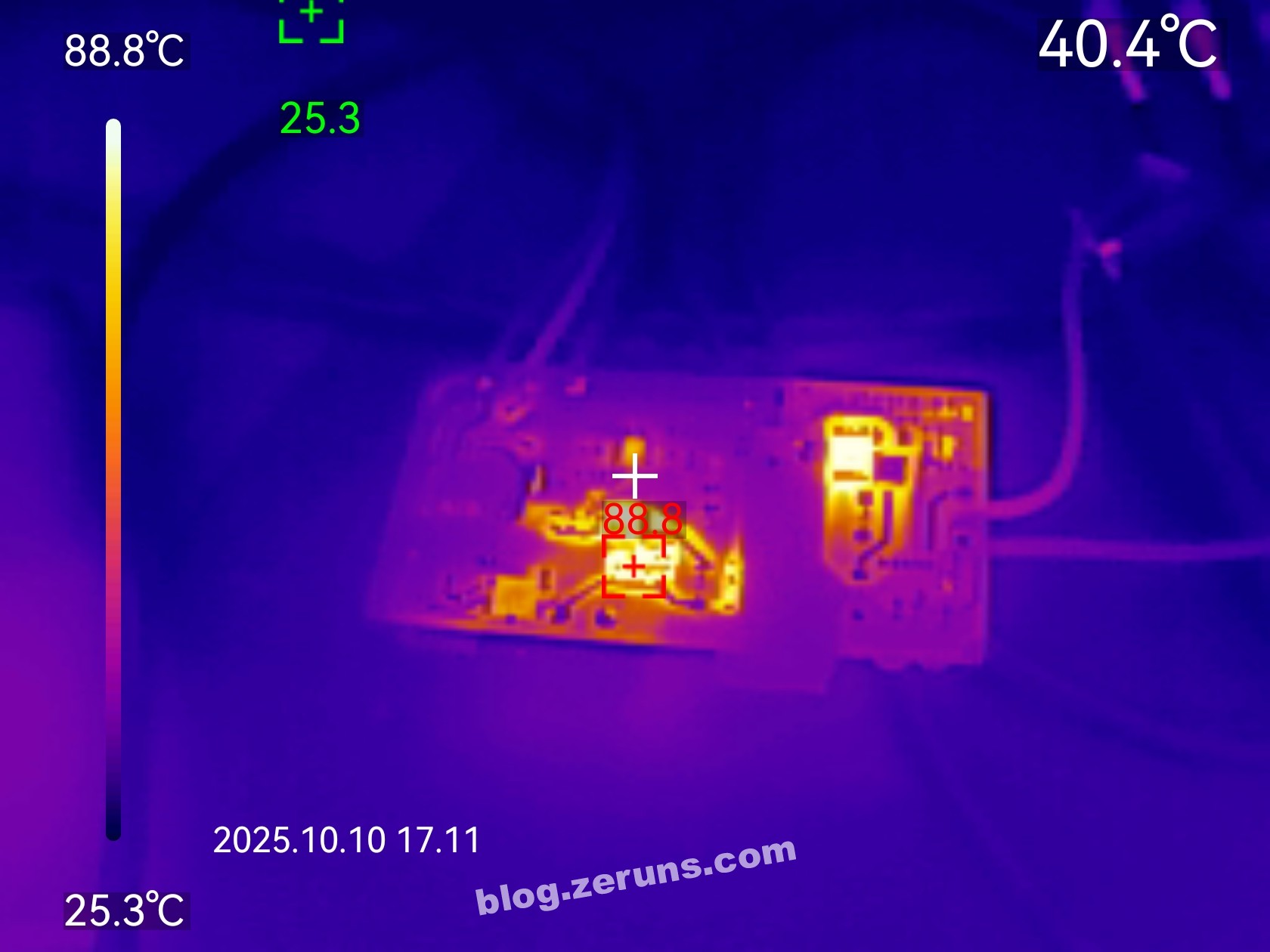 带3A负载时电源底面的热成像图,最高温点在初级侧MOS管或RCD吸收电路的电阻上,温度88度以上(环境温度26℃左右),次级的整流二极管应该也有60度以上。