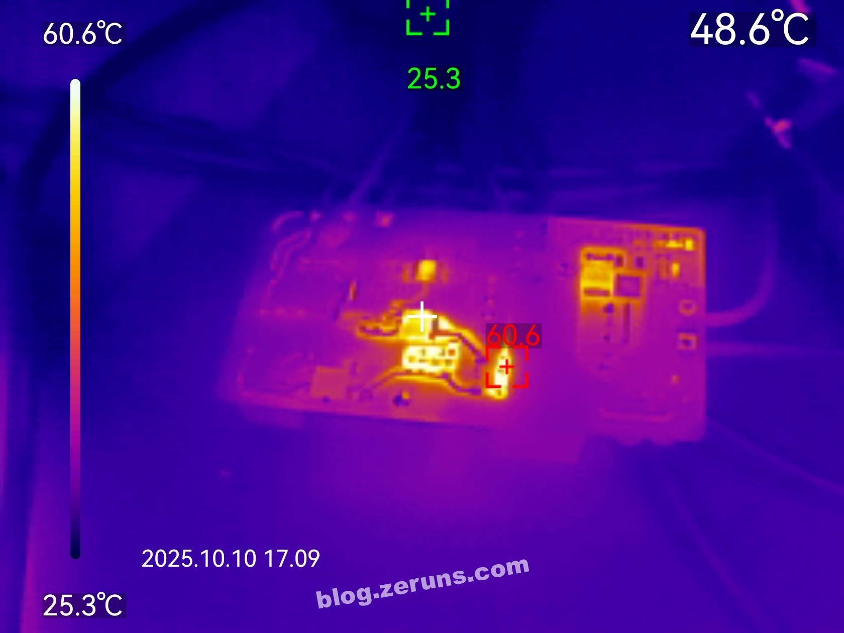 空载时电源底面的热成像图,最高温点在启动电阻上,温度60度左右(环境温度25℃左右),初级侧MOS管温度48℃左右。