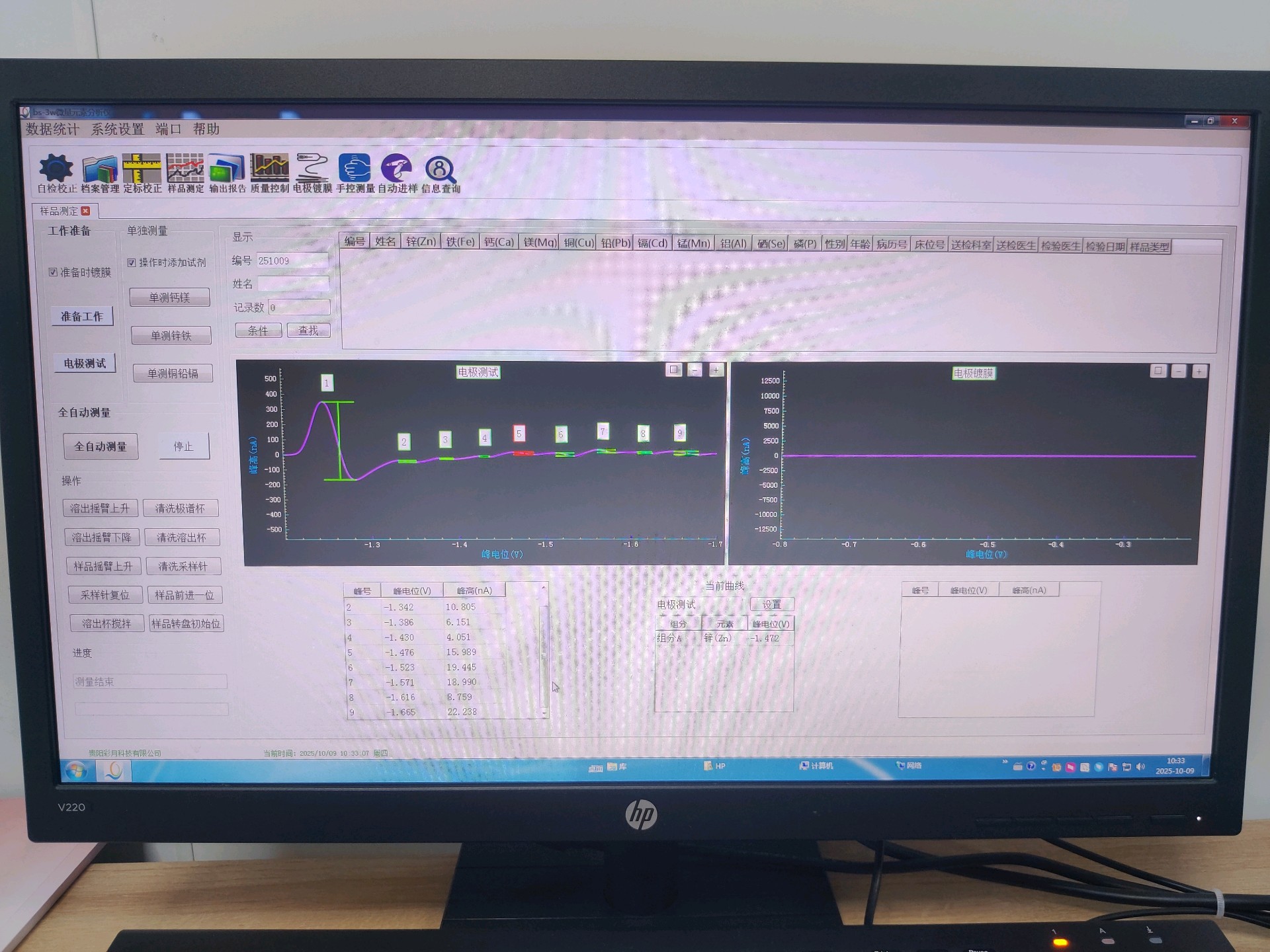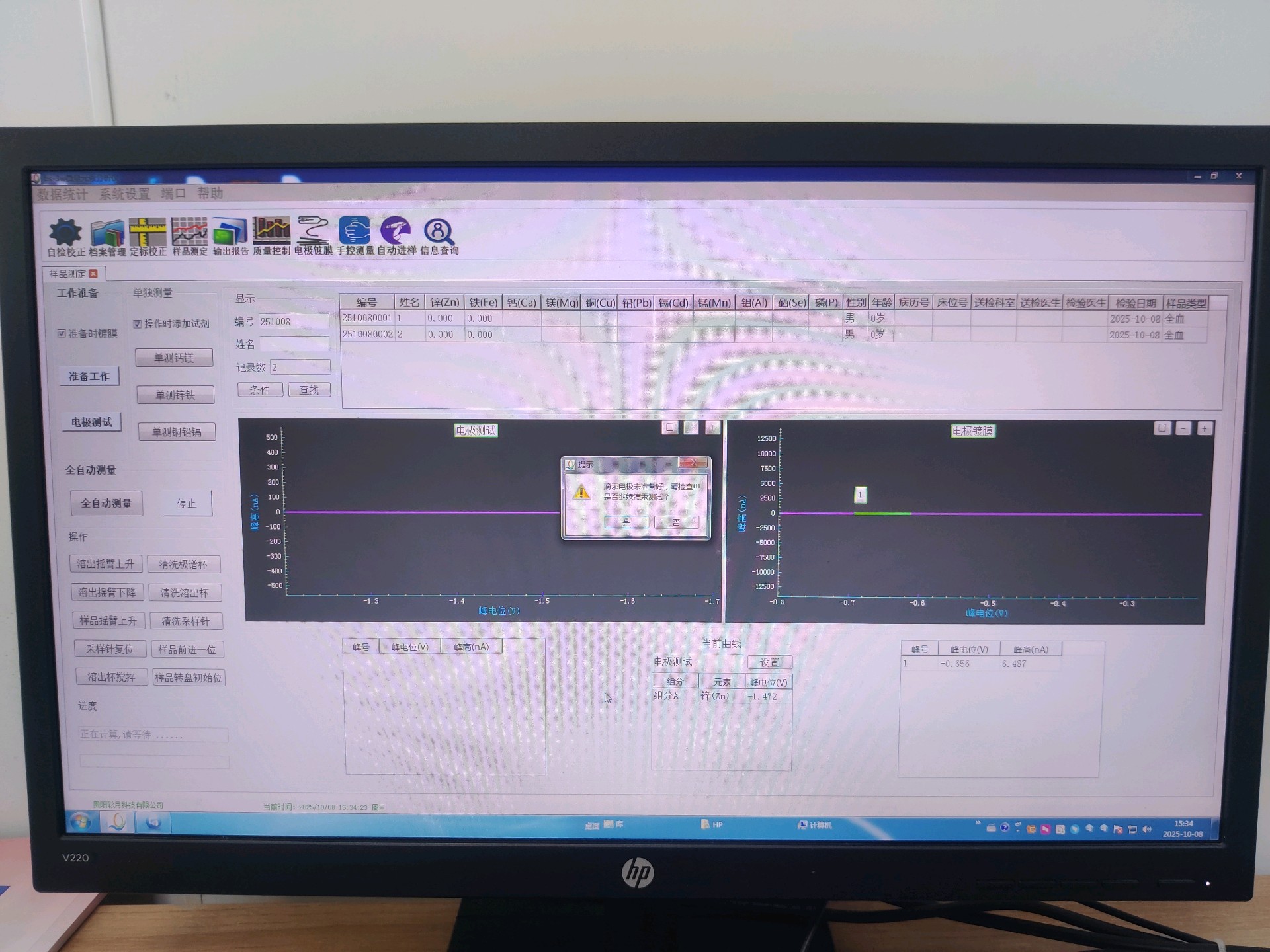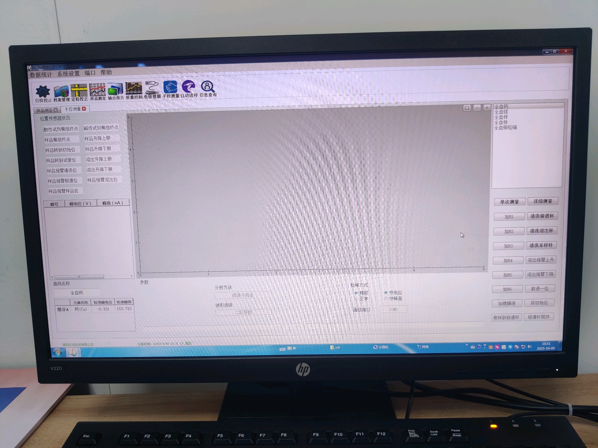 手动测试方法:选择全血锌点击连续测量,这是要把极普杯里加入超纯水,把汞滴管提升手动挤压汞滴软管查看界面有无变化。
