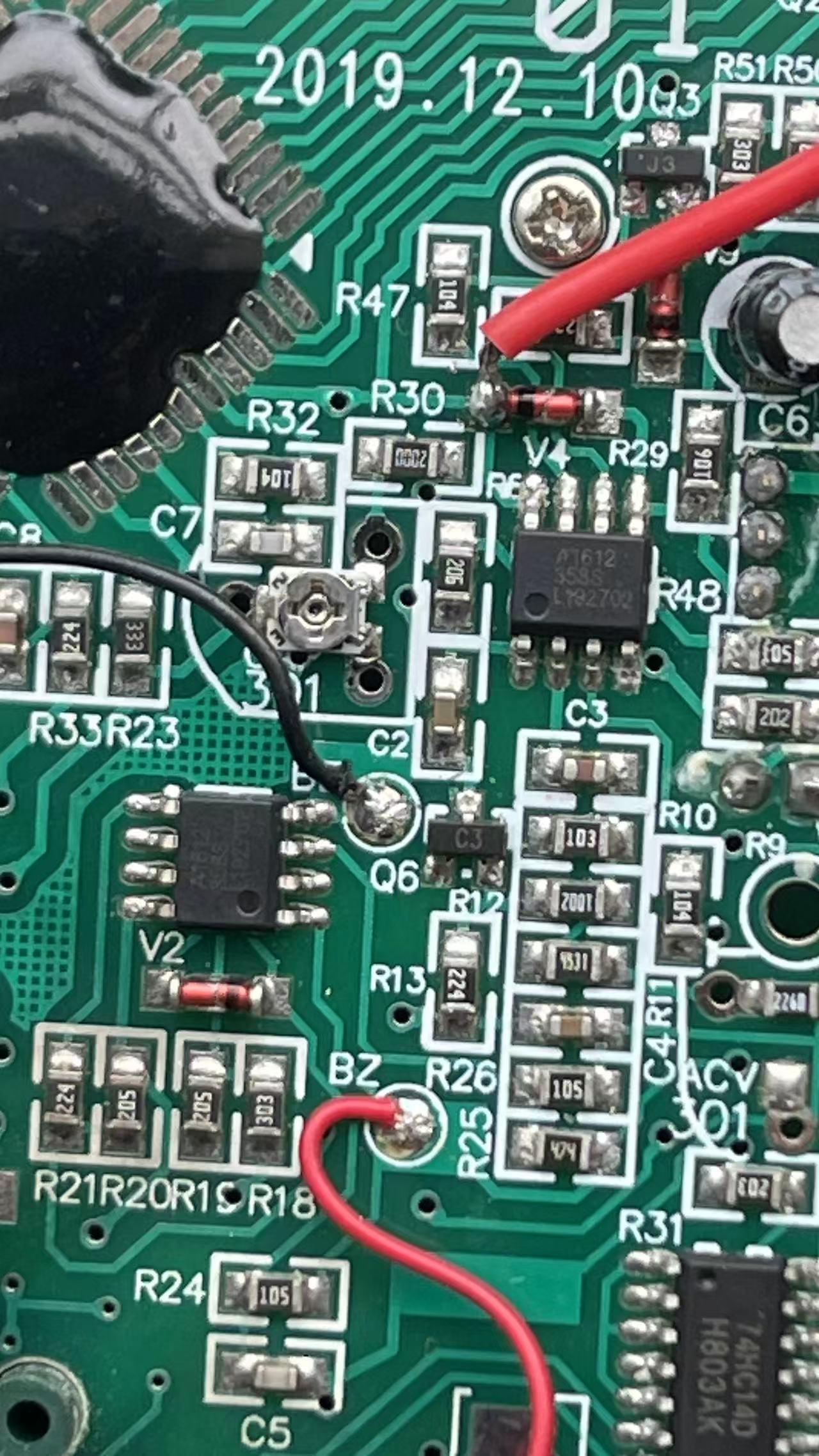 为了研究方便,直接跳过该三极管,在它的前端方便的地方焊接一个红色线,表示这里可以直接供电。如下图R30的旁边焊接的红线: