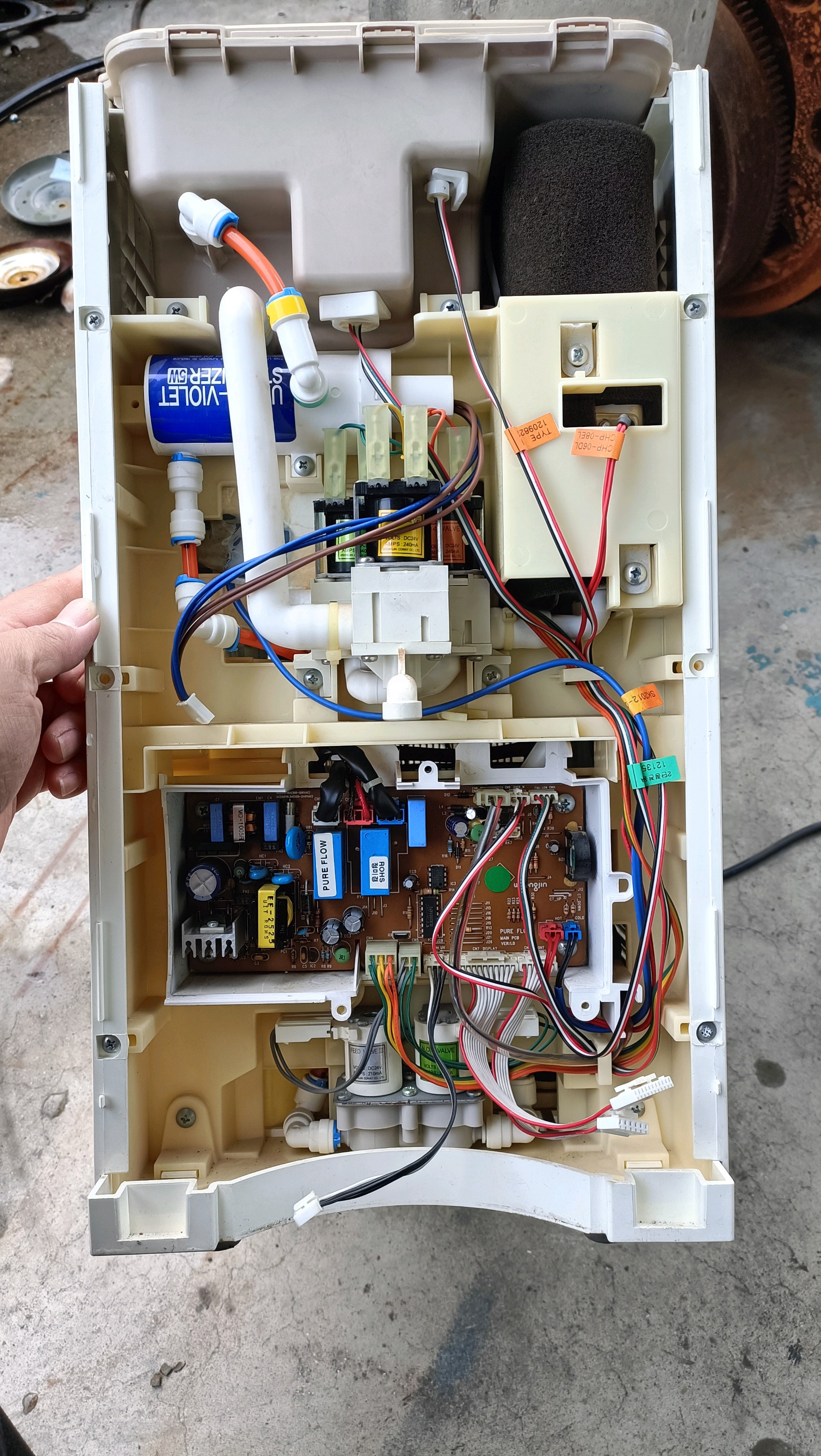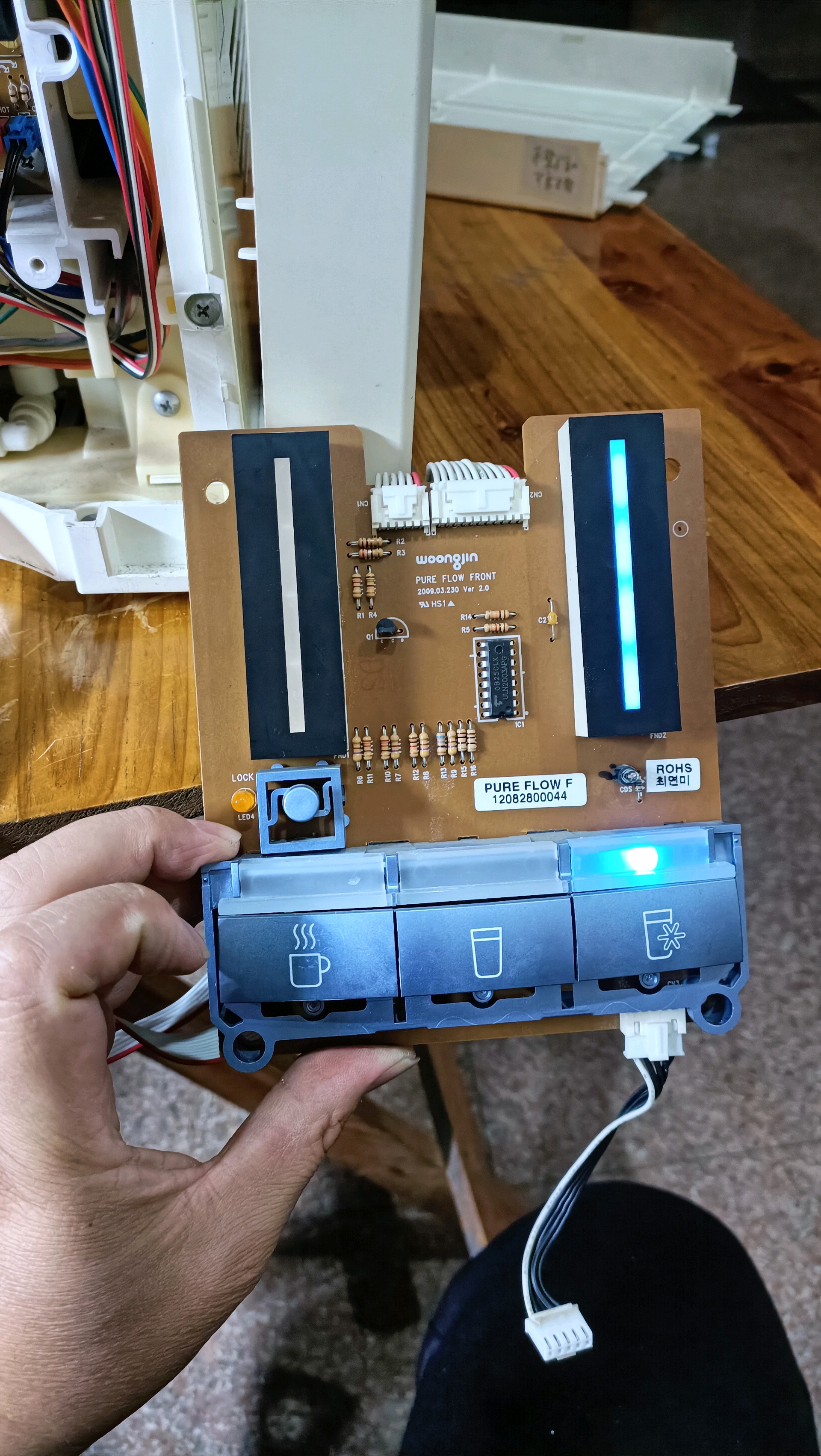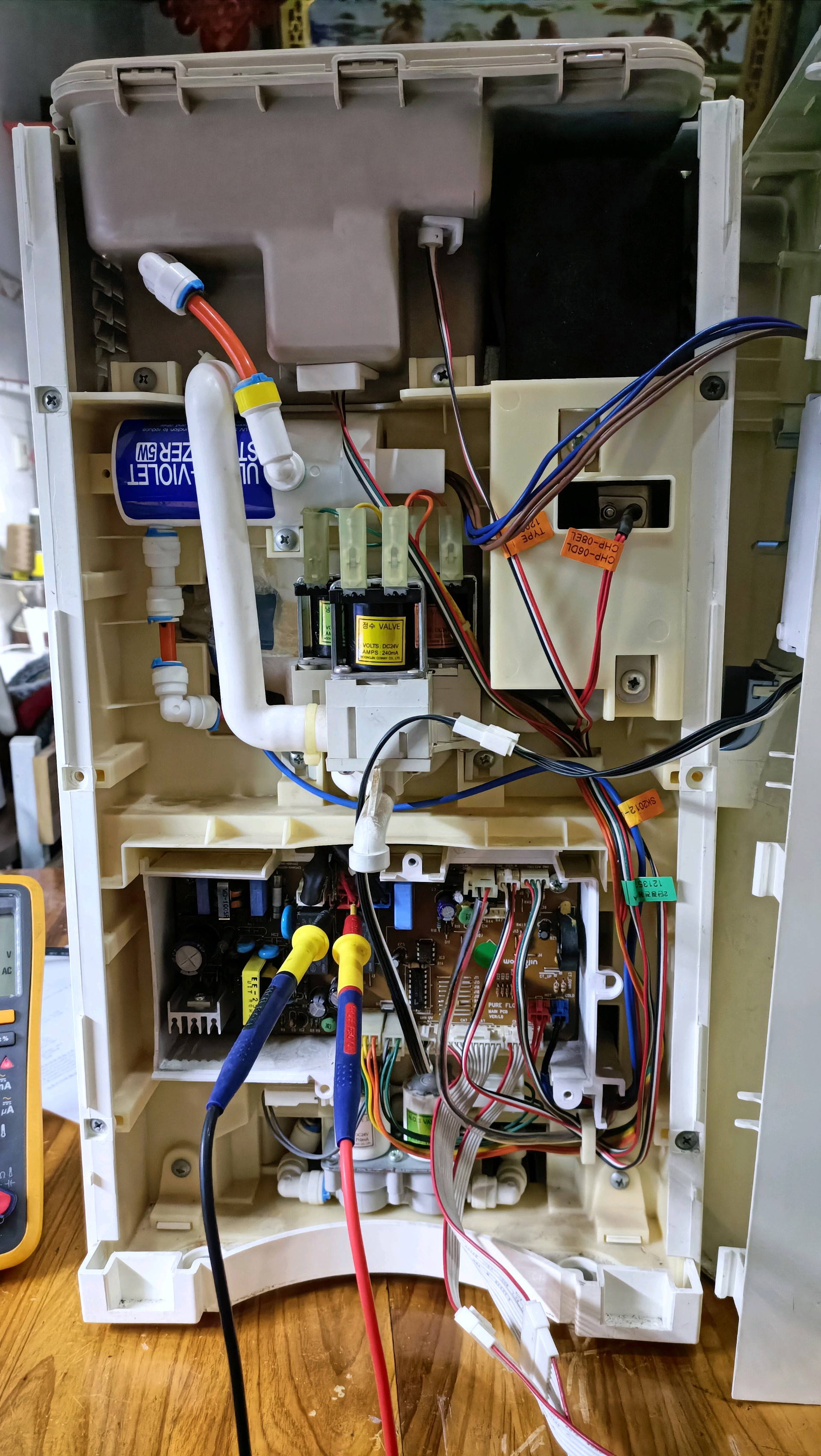 经@圆葱大师,指点,查下驱动芯片2003反向器,为防万一,先断开车cpu连接的电阻,单独给反向器加5v高电平,2003输出脚没有反应,更换2003,恢复电阻,装回饮水机,插好各路插头,由于没有说明书,不知道怎么启动加热功能,问客户,客户说放久了,他也忘记了,没办法只能摸索着试,