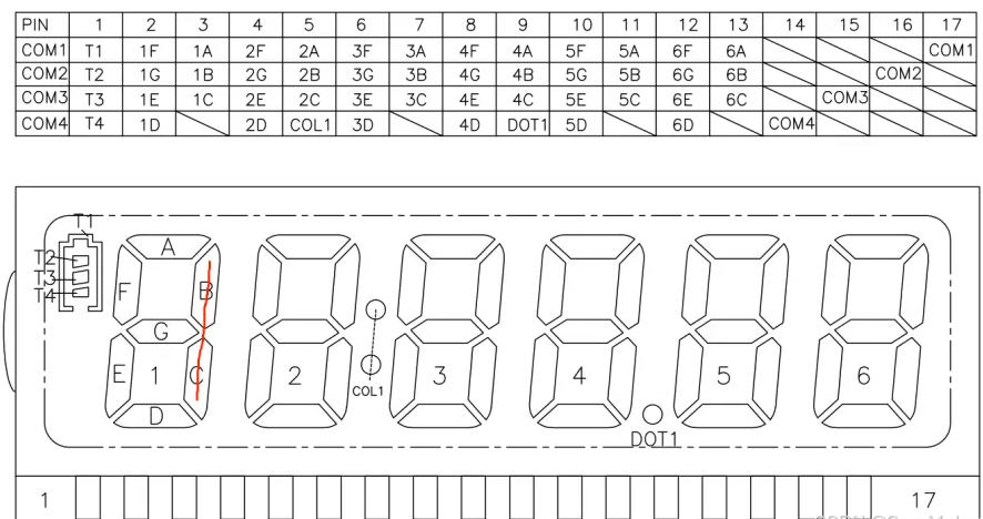 背电极(COM)与段电极(SEG):通过交叉矩阵控制,每个段的亮灭由对应的电极信号决定。