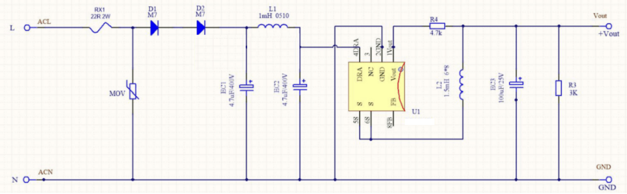 控制芯片存在最低输入电压要求,需要高压电容滤波后给芯片供电。